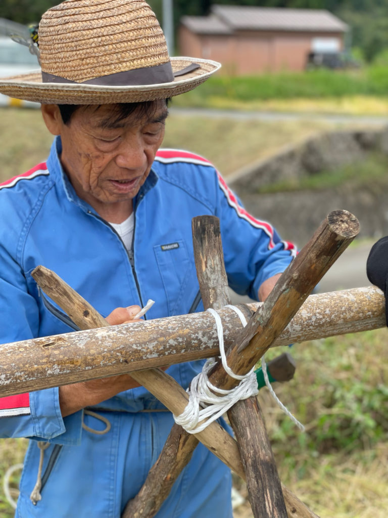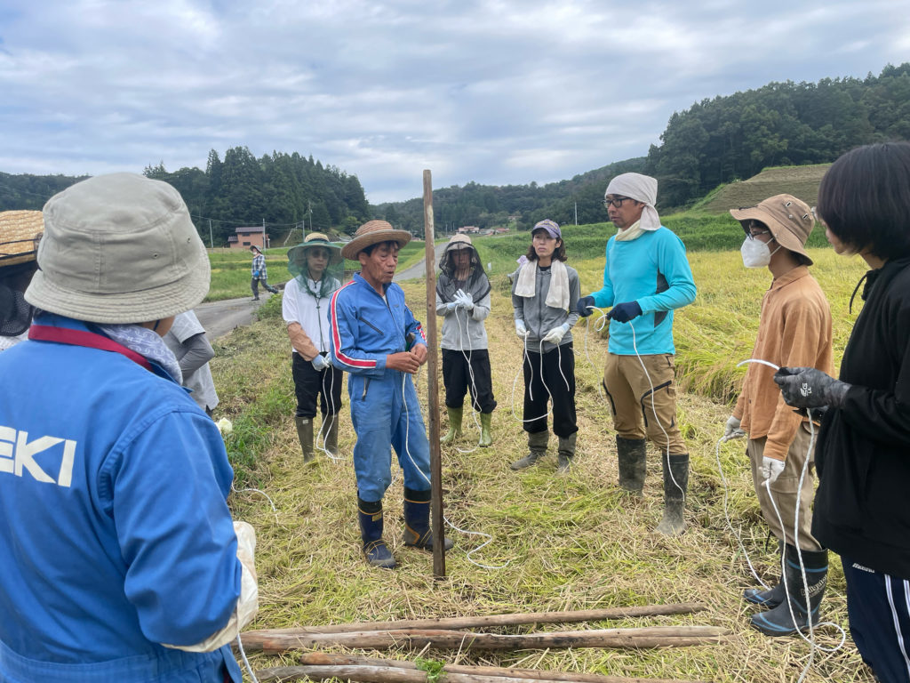 校長先生は手刈りの説明をしました。そして、稲架掛けするための木を組みました。紐の結び方を教わり、みんなで組みました。